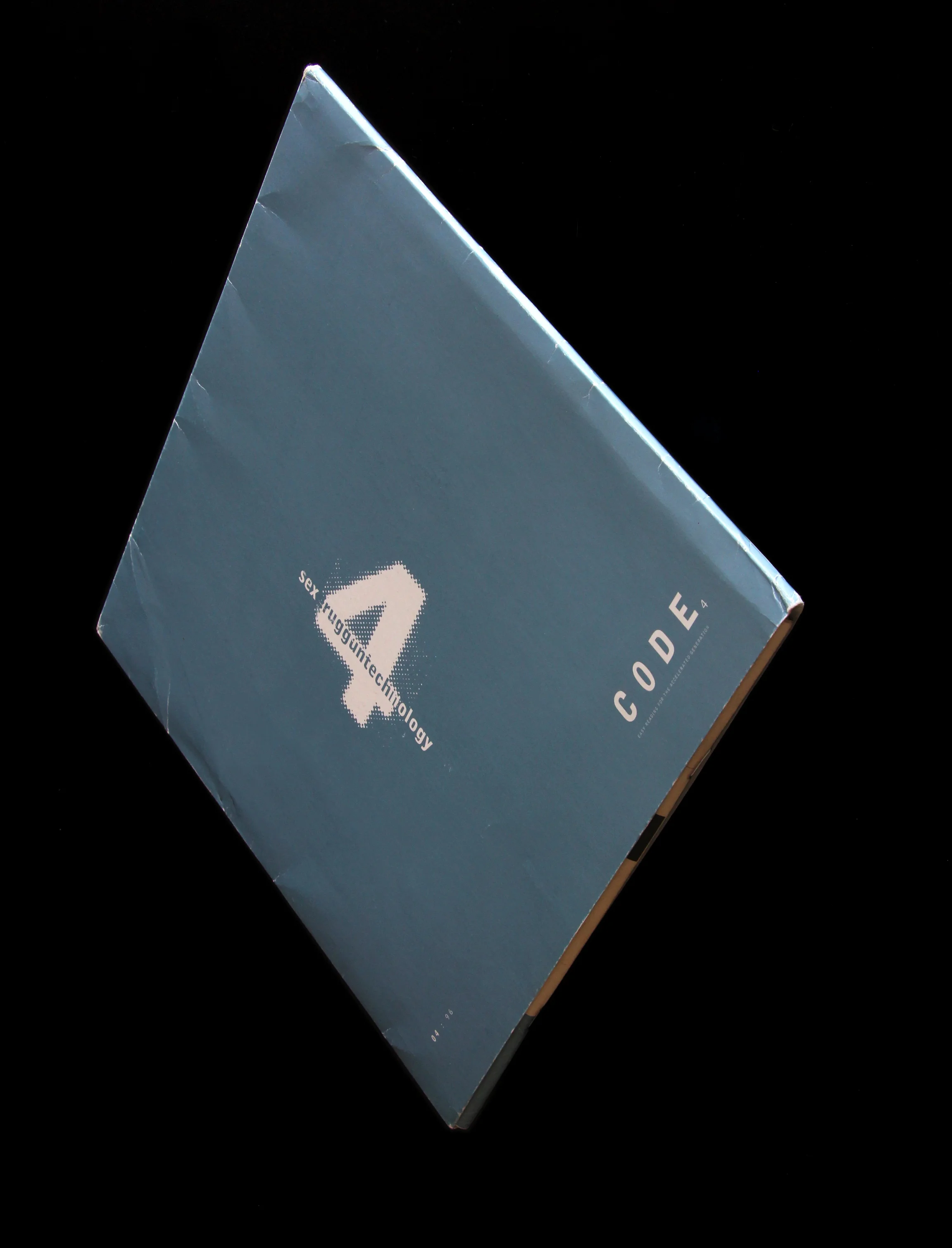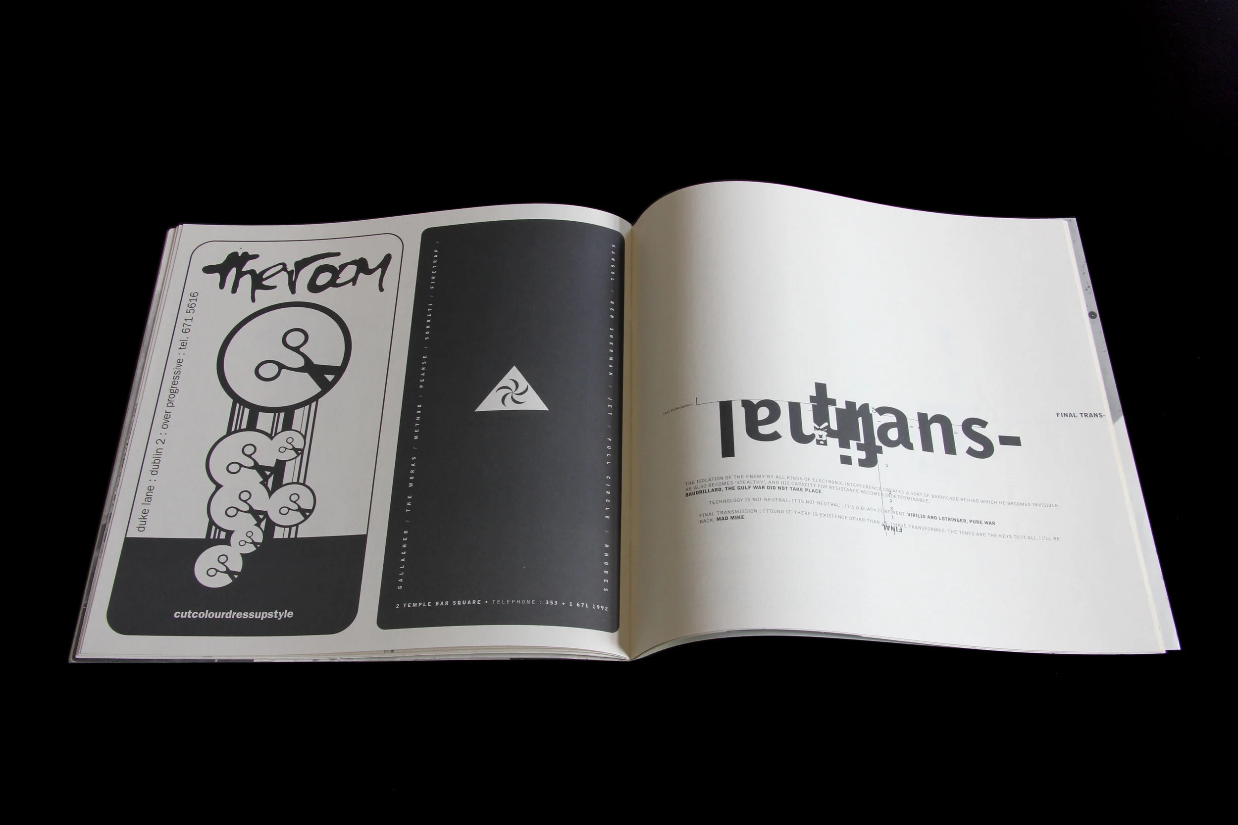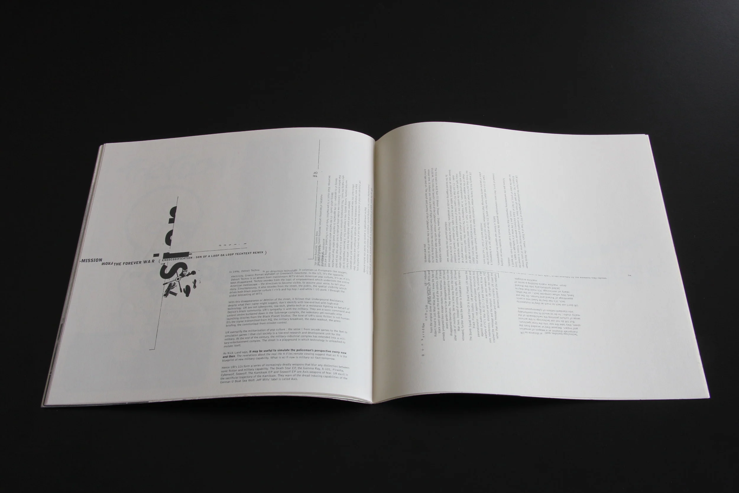 “CODE metaphorically and literally zooms in on the material, working on it in enormous detail, trying to see more and extract more. Text is atomised for its component words, characters and spaces, in search of integrated form and meaning. I am working in a sea of seven-point type, committed to the idea of using individual character forms in an expressive way, disregarding conventional typographic hierarchies. CODE is also to do with the technology. Made on a notvery- powerful machine with ludicrously small storage options (44MB SyQuest disks), working with large images isn’t practical, so I use fragments and build forms integrated with type.”